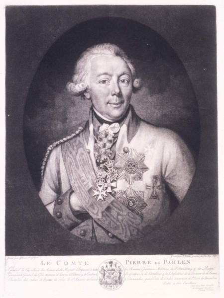 Пален Петр Алексеевич (Петер-Людвиг фон дер; 1745–1826) происходил из старинного германского дворянского рода. В 1760 начал службу в Конной гвардии. Участвовал в русско-турецких войнах, отличившись при штурме Бендер (1770) и Очакова (1788). В 1792 был назначен правителем Рижского наместничества и вел переговоры о присоединении Курляндии к России. С 1795 курляндский генерал-губернатор. При вступлении на престол Павла I одним из первых подвергся опале, однако вскоре был вновь принят на службу и вошел в особое доверие к императору. В 1798–1801 являлся военным губернатором Петербурга. Сумел убедить Павла I, что с целью предотвращения переворота возглавил заговор против него и наблюдает за действиями заговорщиков. Получив письменное повеление императора арестовать наследника, великого князя Александра Павловича, уведомил последнего об этом, чтобы побороть его нерешительность. В расправе над императором лично не участвовал, полагая в случае неудачи поспешить на помощь Павлу и арестовать заговорщиков. 1 апреля 1801 года был уволен от службы и выехал в свое курляндское имение. (А. Мет.)