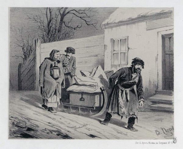 Лист из «Альбома видов и сцен из русской жизни. Автографы московских художников. Собственность издателей-художников». М., 1867. Издание состояло из иллюстрированной обложки и 24 литографированных рисунков разных художников. «Святые шестидесятые». Живопись, графика, скульптура. СПб. 2002. С. 344.