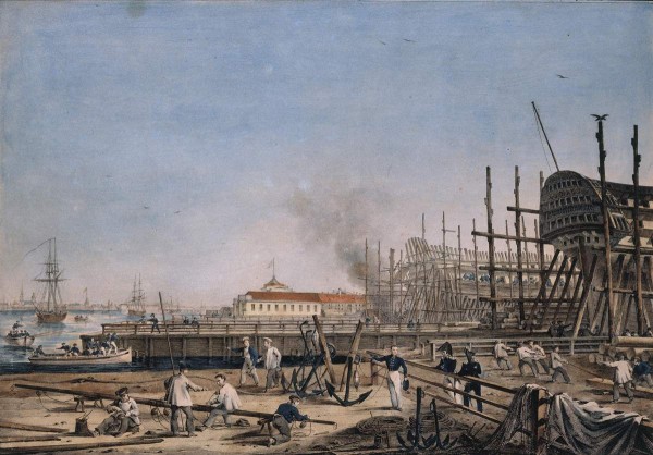 Вид с Невы на эллинги Адмиралтейства со строящимися кораблями. Лист входил в серию «Собрание видов Санкт-Петербурга и окрестностей», издававшуюся Обществом Поощрения художеств в середине 1820-х годов. Елена Мишина // Санкт-Петербург: Портрет города и горожан. СПб, 2003. С. 39.
