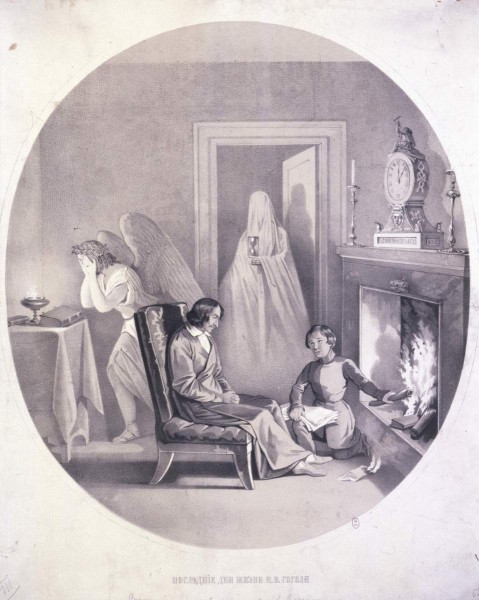 По воспоминаниям современников, в последние годы жизни здоровье и душевное состояние Гоголя сильно ухудшились. Он тяжело переживал критику первого тома «Мертвых душ», но продолжал работать над второй частью произведения. Мучительная борьба между художником и христианином, которая шла в нем с начала 1840-х годов, не покидала его. По своему обыкновению, он много раз переделывал написанное. За месяц до смерти, в ночь с 11 на 12 февраля 1852 года, Гоголь разбудил своего слугу Семена, велел ему затопить печь и принести из шкафа портфель. Вынув из него связку тетрадей с рукописью второго тома «Мертвых душ», Гоголь бросил их в камин и сжег. (Д. М.) Электронный каталог «Герои и злодеи русской истории». СПб, 2010. С. 297.