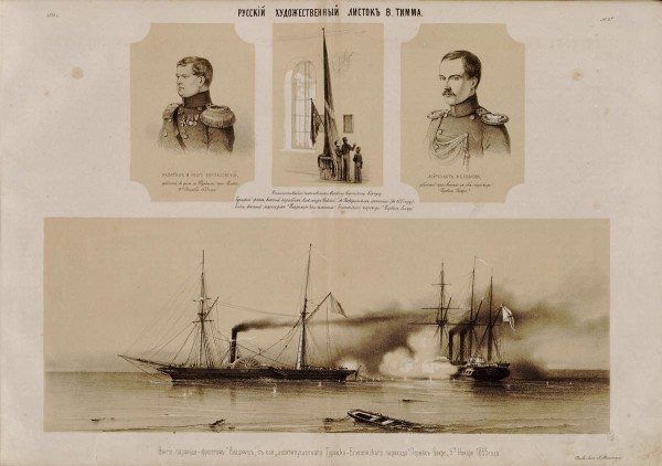 1. Взятие парохода - фрегатом "Владимир" с боя ..." Турецко-египетского парохода "Первас-Бахре" 2. Портрет капитана Верлаховского 3. "Пожалованный ... морскому корпусу ... турецкий флаг ..." 4. Портрет лейтенанта Железнова
