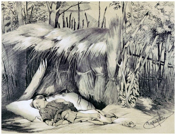Лист из «Альбома видов и сцен из русской жизни. Автографы московских художников. Собственность издателей-художников». М., 1867. Издание состояло из иллюстрированной обложки и 24 литографированных рисунков разных художников. «Святые шестидесятые». Живопись, графика, скульптура. СПб. 2002. С. 344.