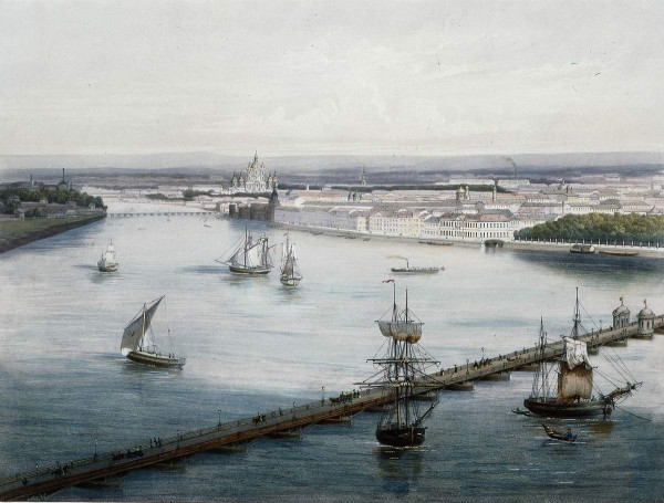 Альбом состоит из пяти листов, представляющих единую панораму левобережной части Невы. Серия литографий, раскрашенных акварелью, выполнена по натурным рисункам ландшафтного архитектора Ж. Бернардацци. Композиционно все листы связаны в единую панораму. С колокольни Петропавловской крепости открывается вид на Неву и парадную часть левобережья от Смольного собора до устья реки. Вид сверху, захватывая часть крепостной стены и бастионов Петропавловской крепости, простирается вглубь, включая невские берега, Выборгскую, Литейную и Адмиралтейскую части Петербурга. На фоне парадных фасадов набережной изображены парусные суда, лодки, баржи, плоты. Через Неву перекинуты временные наплавные мосты (Воскресенский и Троицкий), которые к концу XIX века были заменены на постоянные. Центральным звеном в панораме невских берегов является ансамбль Дворцовой набережной. На фоне ее застройки просматриваются вертикали шпилей Михайловского замка, Симеоновской и Пантелеймоновской церквей, Александровская колонна и купола петербургских соборов. Ансамбль стрелки Васильевского острова, сформировавшийся к началу XIX века, является архитектурной доминантой Невской панорамы. Монументальное здание Биржи и Ростральные колонны с симметричными корпусами зданий пакгаузов замыкают панораму центра Петербурга. Серия листов с видами Петербурга сохранила облик ансамбля Невской панорамы середины XIX века, и в этом ее исторический и художественный интерес. Елена Филиппова // Санкт-Петербург: Портрет города и горожан. СПб, 2003. С. 53.