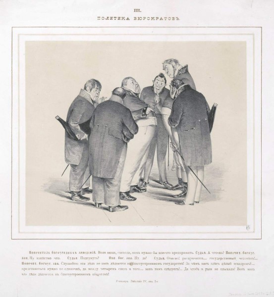Бюрократический катехизис. Пять сцен из «Ревизора». Эскизы Боклевского. 1863