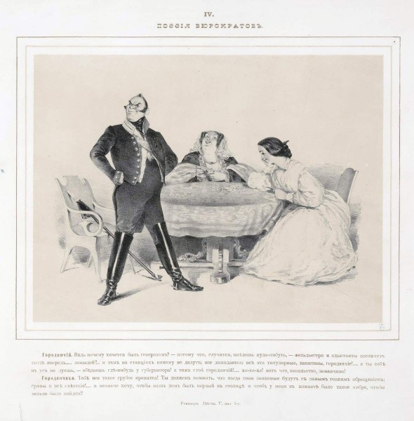 Из альбома «Бюрократический катехизис». Пять сцен из «Ревизора». Эскизы Боклевского [М., 1863]. «Святые шестидесятые». Живопись, графика, скульптура. СПб. 2002. С. 345.