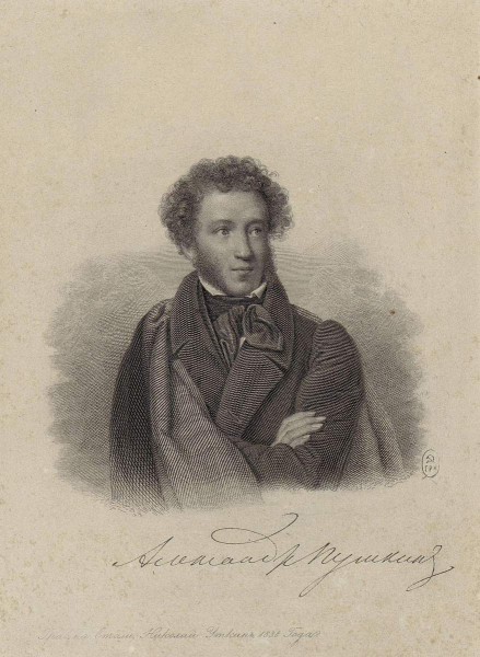 Авторское повторение с гравюры 1827 года. Одно из самых популярных изображений А. С. Пушкина. По воспоминаниям Уткина, гравюра была заказана самим А. С. Пушкиным, но выполнена уже после смерти поэта. Портрет приложен к „Сочинениям А. С. Пушкина" (Т. 1. СПб, 1838).