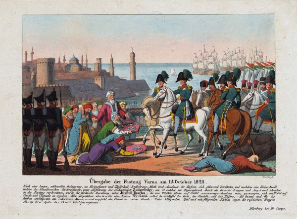 При осаде турецкой крепости Варна присутствовал сам Николай I, прибывший на входящем в состав эскадры адмирала Алексея Грейга корабле «Париж». 29 сентября (11 октября), через три дня после генерального штурма, крепость капитулировала, а ее ключи были вручены российскому императору. Взятие Варны стало наиболее крупным успехом русских войск в кампании 1828 года на Балканском театре военных действий. Лист входил в большую гравированную серию, освещавшую события, связанные с внешней политикой Российской империи в царствование Николая I. Серия издавалась в Нюрнберге у F. Campe.