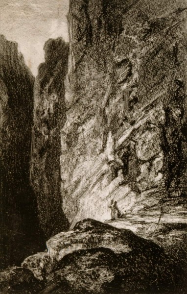 Литографией же Шишкин увлекся довольно рано и всерьез. Проведя лето 1858 года на Валааме, той же осенью он задумывает издать альбом литографий с видами острова. Зима 1859–1860 годов прошла в изучении техники литографирования. Задуманный альбом не был издан, но в начале 1860-х появляются первые литографии Шишкина. Все они навеяны мотивами Валаамской природы. Это чрезвычайно редкая литография «Ущелье», известная в отпечатках (без подписи), сделанных, вероятно, самим автором. Тогда же, в начале 1860-х, в известном петербургском литографическом заведении Александра Мюнстера были отпечатаны еще два Валаамских пейзажа Шишкина: «На краю березовой рощи» и «Скала в сосновом лесу».