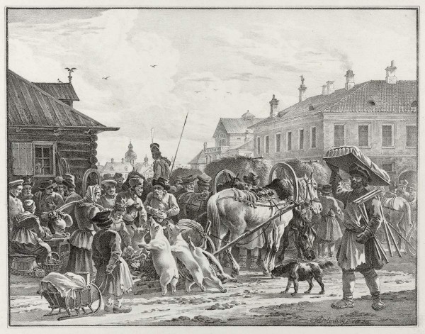 Сцена торговли свиньями и сеном, как это обычно для Орловского, рисована с натуры. На участке по Садовой улице между Спасским и Таировым переулками находился старейший городской рынок, получивший название Сенной, а площадь, на которой он размещался, соответственно, Сенная, по главному своему товару — сену. Помимо сена здесь шла торговля другими товарами крестьянского хозяйства. Свинина привозилась в Петербург из хлебородных губерний. Зимой целые «стада» мороженой свинины расставлялись в мясных рядах Сенного рынка. Галина Павлова // Санкт-Петербург: Портрет города и горожан. СПб, 2003. С. 280.