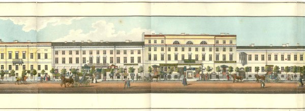 Одна из самых знаменитых панорам Петербурга XIX века. Уникальная, почти 16-метровая лента, склеенная из 30 листов, с документальной точностью фиксирует застройку главной магистрали города — Невского проспекта, от Адмиралтейства до Фонтанки. Панорама выполнена по заказу А. М. Прево (1801-1867), издателя и комиссионера ОПХ, художником В. С. Садовниковым — автором акварельного оригинала — и литографами однофамильцами Ивановыми. Панорама состоит из двух свернутых в рулон лент: „Правая, теневая сторона Невского проспекта" (1830) и „Левая, солнечная сторона Невского проспекта" (1835). В ней использовались не только натурные зарисовки, но и проектные чертежи с не достроенных на тот момент зданий.