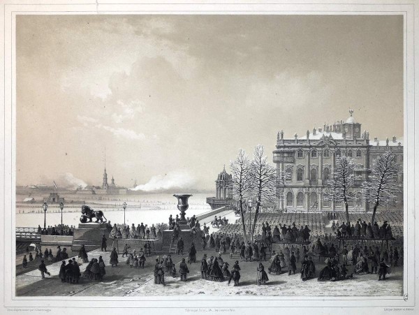 Изображено празднование одного из двунадесятых православных праздников ‒  Крещения (Богоявления). Традиционно в день Крещения проходил церковный парад у стен Зимнего дворца и молебен с освящением воды в присутствии императорской фамилии. На Неве напротив Эрмитажа строился павильон „Иордан", где совершался молебен и окропление святой водой знамен всех гвардейских полков. На гравюре показан вид со стороны Адмиралтейства: парад, гуляющая публика, заполнившая площадь и часть наплавного моста; на набережной Невы ‒ часовня. На фоне Петропавловской крепости изображен ипподром, который ежегодно устанавливался, как только Нева покрывалась льдом. Основные христианские праздники, демонстрируя „единение" сословий всего православного Петербурга, входили в число официальных столичных торжеств. Елена Филиппова // Санкт-Петербург: Портрет города и горожан. СПб, 2003. С. 434.