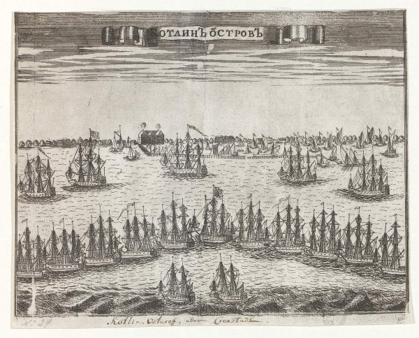 Изображен остров Котлин с первыми постройками города Кронштадта. Относится к числу так называемых малых видов, которые подклеивали к большой „Панораме Петербурга” 1716 года работы А. Ф. Зубова. Елена Мишина // Санкт-Петербург: Портрет города и горожан. СПб, 2003. С. 34.