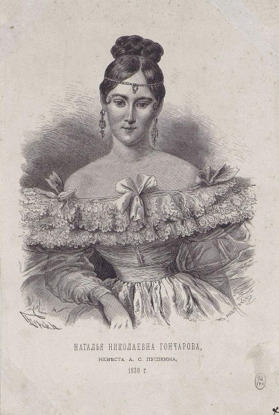 Наталья Николаевна Гончарова, в первом браке Пушкина, во втором — Ланская (27 августа [8 сентября] 1812, поместье Кариан, Тамбовская губерния — 26 ноября [8 декабря] 1863, Санкт-Петербург) — супруга Александра Сергеевича Пушкина. Родилась в селе Кариан Тамбовской губернии, родовом поместье Загряжских, куда Гончаровы переехали на время Отечественной войны 1812 года. Детство и юность Наталья провела в Москве и поместьях Ярополец (Московская губерния) и Полотняный Завод (Калужская губерния). Пушкин встретил Наталью Гончарову в Москве в декабре 1828 года на балу. Помолвка состоялась 6 мая 1830 года, 18 февраля (2 марта) 1831 года состоялось венчание в московской церкви Большого Вознесения у Никитских ворот.