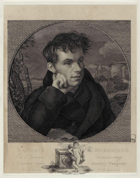 Василий Андреевич Жуковский – один из основателей «Арзамасского общества безвестных людей» и его бессменный секретарь – вспоминал: «Мы объединились, чтобы хохотать во все горло, как сумасшедшие; и я, избранный секретарем общества, сделал немалый вклад, чтобы достигнуть этой главной цели, т. е. смеха; я заполнял протоколы галиматьей, к которой внезапно обнаружил колоссальное влечение. До тех пор, пока мы оставались только буффонами, наше общество оставалось деятельным и полным жизни; как только было принято решение стать серьезными, оно умерло внезапной смертью». Время создания Кипренским живописного портрета почти совпадает с началом деятельности Арзамаса, а год создания гравюры, которая посвящена члену этого общества графу С. С. Уварову, – с моментом ее окончания.