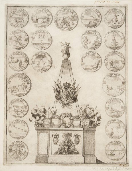 Так называемая Гренгамская пирамида была построена на Троицкой площади в Петербурге по случаю торжества в честь победы в морском сражении при Гренгаме. Она представляла собой обелиск с аллегорическими фигурами и атрибутами‚ а также с картинами, символизирующими победу русского оружия. На гравюре эти картины размещены вокруг пирамиды. Елена Мишина // Санкт-Петербург: Портрет города и горожан. СПб, 2003. С. 37.