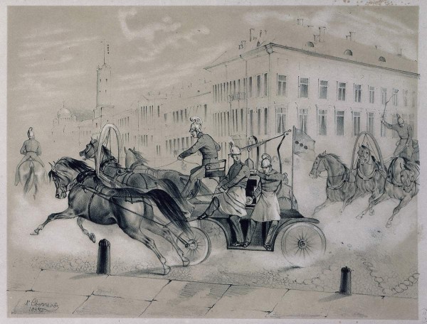 Пожары являлись одной из серьезнейших проблем Петербурга. В начале XIX века была создана городская пожарная команда. На улицах установили высокие деревянные башни, с которых велись наблюдения. С каланчи трудно было определить силу пожара, поэтому на тушение отправлялись обычно все находившиеся на дежурстве. Пожарные мчались под громкий треск погремушек, привязанных к сбруям лошадей. Ольга Власова // Санкт-Петербург: Портрет города и горожан. СПб, 2003. С. 220.