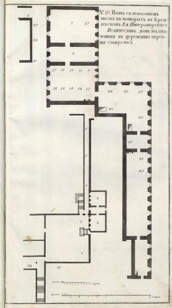 «Меж тем знатные особы и прочие чины мужского пола, определенные к церемонии высочайшей коронации в шесть часов по полуночи собирались в Кремлевском ЕЯ ИМПЕРАТОРСКОГО ВЕЛИЧЕСТВА доме, каждый под свой номер, которые накануне того дня от комиссии в надлежащих местах поставлены были.