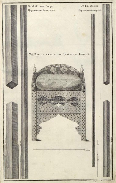 № 11. Кресла, бывшие в аудиенц-камере. № 12. Жезлы церемониймейстеров. № 13. Жезлы обер-церемониймейстеров