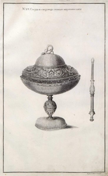 И тогда первый Новгородский Архиерей, из нарочнаго к тому приуготовленного драгаго яшмового пребогато золотом и преизрядною финифтьною с резьбой работою украшенного сосуда, омоча драгоценный и к тому нарочно устроенный златый сучец во святое миро, помазал ЕЯ ИМПЕРАТОРСКОЕ ВЕЛИЧЕСТВО на челе, на очах и ноздрях, на устах, на ушах, на рамех, на персах и по обою сторону на руках глаголя: ПЕЧАТЬ ДАРА ДУХА СВЯТОГО. А другой Псковский Архиерей места помазанные чистою хлопчатою бумагой отирал. По совершении же миропомазания был великий звон и другая из такого ж числа, как прежде, пушек и от полков беглым огнем пальба». См. подробнее полную версию альбома на сайте Президентской библиотеки. С. 72-73.