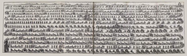 3) Двадцать девять карет знатных особ с пребогатыми экипажами, пред которыми шли напреди лакеи и скороходы; а около карет гайдуки в пребогатых же ливреях. И во оных ехали сами господа тех карет, бывшие в сей церемонии, а которые не были, тех кареты шли порозжие, каждая по чести, чья оная, в своем месте.