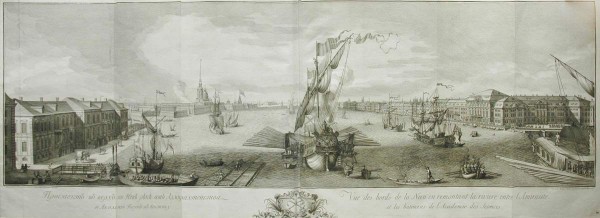 Справа, на набережной Васильевского острова — бывший дворец царицы Прасковьи Федоровны (вдовы царя Иоанна Алексеевича; арх. Г.-И. Маттарнови, Г. Киавери, М. Г. Земцов), который в середине XVIII века занимали художественные мастерские Академии наук. Тут помещались, среди прочих, Рисовальная, Ландкартная и Гравировальная палаты, где работал Махаев и где граверы резали доски по его оригиналам. Далее — Петропавловская крепость. Справа, на Верхней набережной (ныне Дворцовая) — третий Зимний дворец, выстроенный для Анны Иоанновны (арх. Ф.- Б. Растрелли). Петербург Михаила Махаева. СПб, 2022. С. 55.