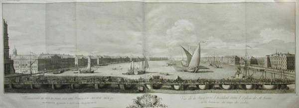 На первом плане — Исаакиевский наплавной мост. Слева — угол колокольни Исаакиевской церкви (арх. Г.-И. Маттарнови). Далее на левом берегу — дворец канцлера А. П. Бестужева-Рюмина, для которого Махаев в 1750-е годы исполнил рисунки имения на Каменном острове, затем переведенные в гравюру (Гр.-31866; Гр.-31864; Гр.-35023). Справа, на набережной Васильевского острова — Сухопутный шляхетский кадетский корпус (ранее — дворец А. Д. Меншикова, арх. Д.-М. Фонтана, И.-Г. Шедель). Петербург Михаила Махаева. СПб, 2022. С.59.