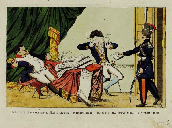 Казак вручает Наполеону визитной билет на взаимное посещение