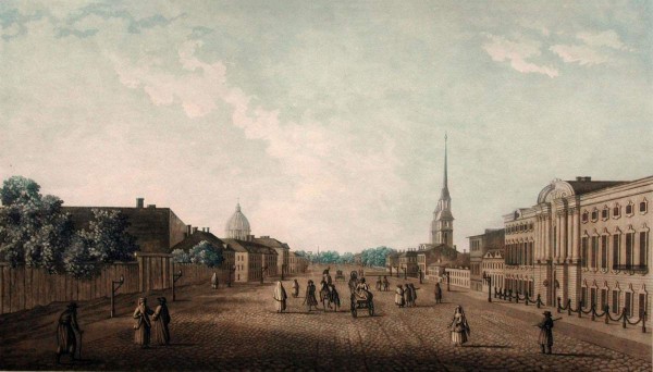 Изображен Невский проспект по направлению к Фонтанке. Слева купол лютеранской церкви апостола Петра, построенной в 1730 году по проекту фельдмаршала X. Миниха (в 1832— 1838 на этом месте архитектор А. П. Брюллов возвел новое здание). Справа Строгановский дворец, далее церковь Рождества Богородицы (1733-1737, архитектор М. Г. Земцов). Церковь была уничтожена в связи с постройкой Казанского собора, возведенного на этом месте в 1801— 1811 годах. Ольга Власова // Санкт-Петербург: Портрет города и горожан. СПб, 2003. С. 195.