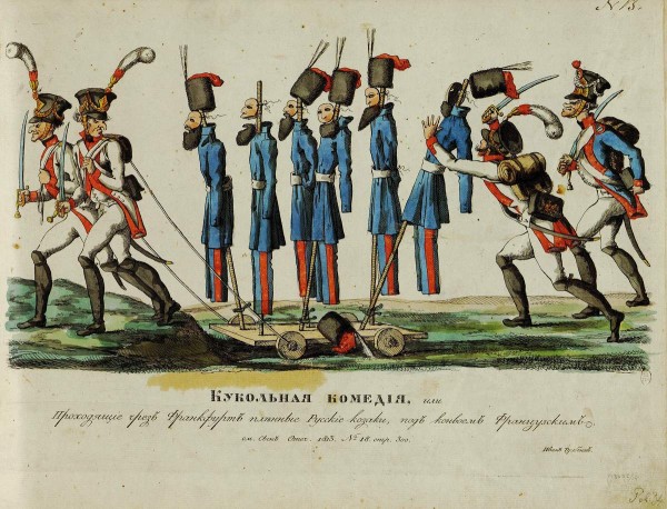 Расцвет политической сатиры на темы нашествия на Русь «двунадеся языков» связан, прежде всего, с творчеством Алексея Венецианова, Ивана Теребенева и Ивана Иванова. Главный герой их карикатур Наполеон («Мыльные пузыри», «Русская пляска», «Бегство Наполеона», «Проезд высокого путешественника от Варшавы с ощипанным орлом и ознобленным мамелюком») хорошо узнаваем по невысокой, плотной фигуре, форменной одежде и знаменитой «наполеоновской» треуголке, однако же, естественно, лишен всякого величия, романтической загадочности и характерных «высоких дум» на челе.