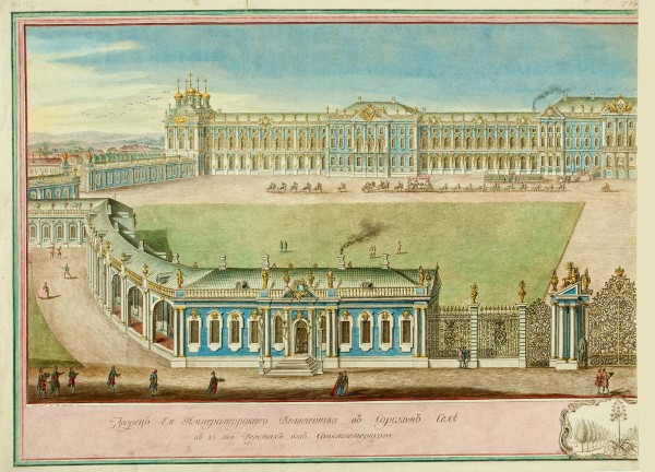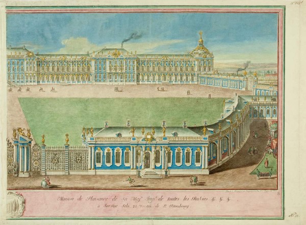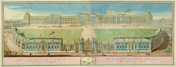 Гравюра отпечатана с двух досок. Первую доску Внуков закончил в августе 1759-го. Над второй — трудился в течение всего 1760 года, но из-за болезни довести дело до конца не смог. В 1761 году работу завершили художники следующего поколения — Н. Ф. Челнаков и П. А. Артемьев. Царскосельский (Екатерининский) дворец (арх. Ф.-Б. Растрелли) изображен со стороны парадного двора. Петербург Михаила Махаева. СПб, 2022. С. 86-87.