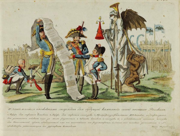 Расцвет политической сатиры на темы нашествия на Русь «двунадеся языков» связан, прежде всего, с творчеством Алексея Венецианова, Ивана Теребенева и Ивана Иванова. Главный герой их карикатур Наполеон («Мыльные пузыри», «Русская пляска», «Бегство Наполеона», «Проезд высокого путешественника от Варшавы с ощипанным орлом и ознобленным мамелюком») хорошо узнаваем по невысокой, плотной фигуре, форменной одежде и знаменитой «наполеоновской» треуголке, однако же, естественно, лишен всякого величия, романтической загадочности и характерных «высоких дум» на челе.