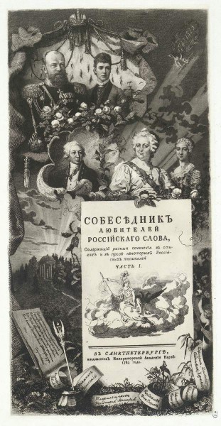 Ежемесячный литературный сборник „Собеседник любителей российского слова" выходил в Петербурге с 1783 по 1784 год. Издавался по инициативе княгини Е. Р. Дашковой и императрицы Екатерины II под редакцией 0. П. Козодавлева. Юбилейный лист был выполнен к 100-летию выхода в свет первого выпуска „Собеседника...". В его композицию включены портретные изображения императора Александра III, его супруги императрицы Марии Федоровны, императрицы Екатерины It Е. Р. Дашковой и Г. Р. Державина. Ольга Скоробогатая // Санкт-Петербург: Портрет города и горожан. СПб, 2003. С. 334.