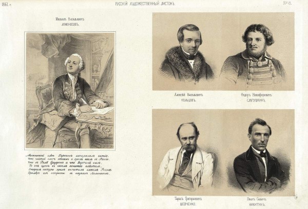 Три изображения: 1. М. В. Ломоносов. 2. А. В. Кольцов и Ф. Н. Слепушкин. 3. Т. Г. Шевченко и И. С. Никитин