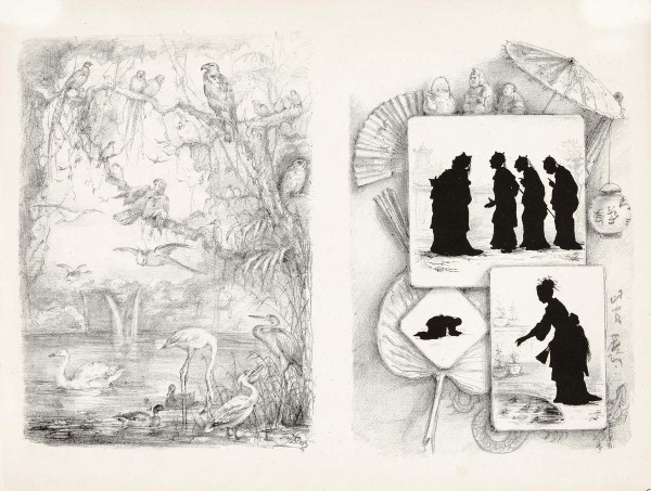 2 изображения: 1. Силуэты китайцев. 2. Жизнь птиц
