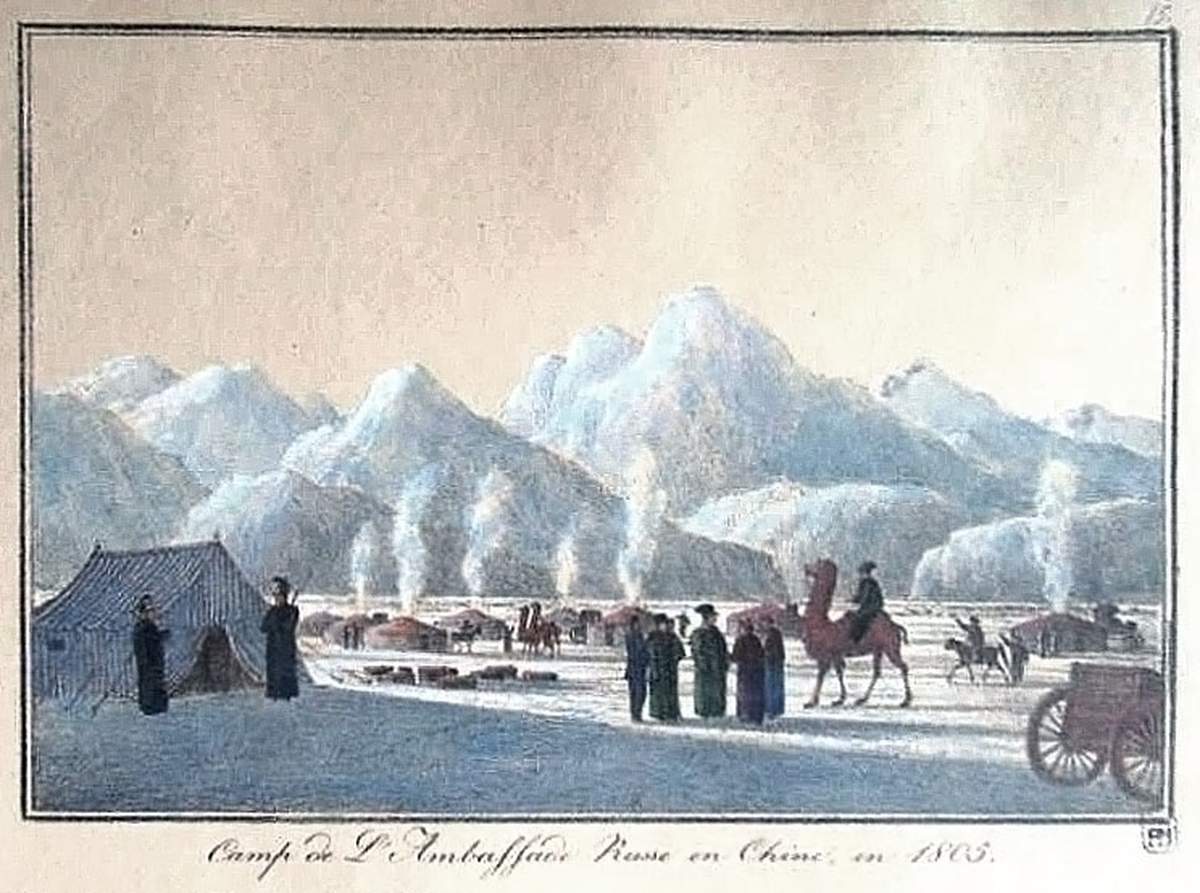 Посольству [графа Ю.А.Головкина в Китай в 1805 году] не удалось выполнить свое главное назначение — добиться важных уступок для благоприятного ведения торговли России в этом регионе. <...> Посольский лагерь, простояв несколько месяцев в ожидании, не продвинулся дальше города Урги (современный Улан-Батор). Было принято решение вернуться в Россию. Как дипломатическая миссия посольство потерпело явную неудачу, но как продолжительное путешествие, давшее Мартынову-художнику множество ярких впечатлений, огромное количество натурного материала, который затем на протяжении почти двух десятилетий использовался им в творчестве, эту поездку трудно переоценить*. <...> Вскоре после возвращения, в 1808 году, художник выпустил серию гравюр, изображающих типы народов России и Монголии.<...>, а в 1819 году издал альбом офортов «Живописное путешествие от Москвы до Китайской границы». В 1822– 1823 вышла в свет еще одна серия, состоящая как из типажных, так и видовых изображений, уже в технике литографии. Наталия Соломатина. Пространства Андрея Мартынова // Андрей Ефимович Мартынов. СПб, 2014. С. 6.