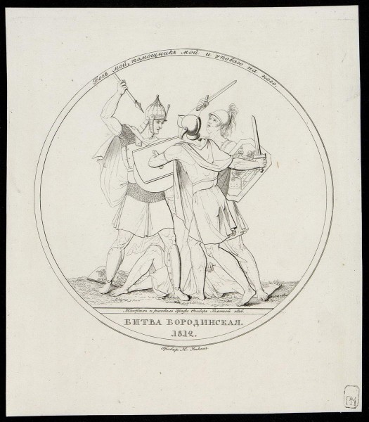 Изображение медали: Русской в броне Славянина стоит твердо против нападающих на него трех врагов, из которых единого низверг к стопам своим, двух же других сильною мышцею и крепким щитом отразил и удержал на время. Три нападающих лица представляют втрое превосходящую неприятельскую силу, из коей падший воин показывает истребленную и сокрушенную часть (Собрание изображений. С. 6). 1812 год в произведениях искусства из собрания Русского музея. СПб, 2012. С. 96.