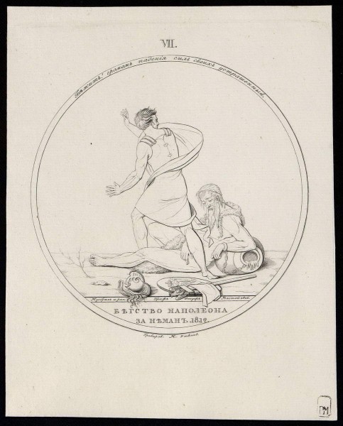 Изображение медали: Увенчанный осокою баснословный старец, опершийся на урну, из которой льется вода, представляет реку Неман. Оковы его показывают, что она в сие время покрыта была льдом. Наполеон, едва обернутый в легкое развеваемое ветром одеяние, переступает через нее. Позади его на берегу реки видны шлем, щит и меч его, в знак совершенной потери всего, что с ним в пределы Российские вступило. Он с ужасом озирается вспять, и при первой надежде спасения своего, как бы от страшного сна пробужденный, едва случившемуся с собою может верить (Собрание изображений. С. 18). 1812 год в произведениях искусства из собрания Русского музея. СПб, 2012. С. 97.