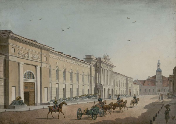 Слева здание Нового Арсенала (1808, архитектор Ф. И. Демерцов), где помещались главные мастерские: чеканная, слесарная, ткацкая и другие, справа — Литейный двор (в 1735 перестроен в камне И. Я. Шумахером, не сохранился). Напротив Нового Арсенала виден портик Старого Арсенала (1770-1780, архитектор В. И. Баженов, не сохранился), в котором размещался военный музей. Софья Бородина // Санкт-Петербург: Портрет города и горожан. СПб, 2003. С. 216.