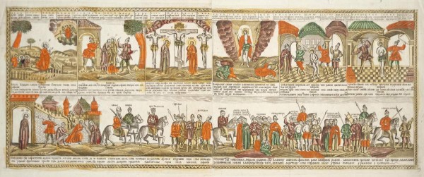 Страстной цикл – одна из излюбленных тем русской гравюры конца ХVII – первой половины ХVIII века. Известны серии листовых гравюр со стихотворными надписями, которые могли по отдельности вклеиваться в рукописные сборники или, переплетенные все вместе, использоваться как небольшая цельногравированная книжица. Композиции всех известных русских гравированных „Страстей“ восходят к западноевропейским оригиналам. Данная картинка не является исключением. Впервые вытянутая по горизонтали двухъярусная композиция, в верхней части которой размещаются клейма: „Моление о чаше“, „Предательство Иуды“, „Распятие“, „Воскресение“, „Венчание тернием“ и „Бичевание“, а в нижней – шествие на Голгофу, была награвирована известным мастером в первой половине ХVIII века. С тех пор она выдержала множество повторений. Чрезвычайно интересны гравированные надписи, сопровождающие страсти. Верхняя строка содержит истолкование распространенных в православной иконописи (особенно в монастырях Палестины и Афона) буквенных монограмм. Средняя составлена в форме рифмованных вопросов и ответов о страстях Христовых. В нижней части перечислены лица, сопровождавшие Христа на Голгофу. Юлия Ходько // Иисус Христос. СПб, 2000. С. 284.