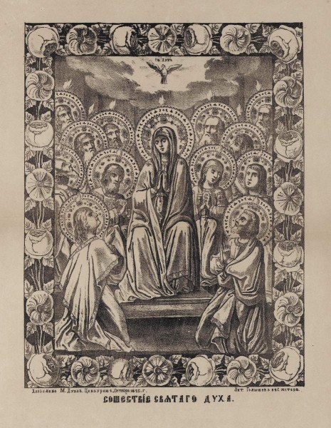 «При наступлении дня Пятидесятницы, все они были единодушно вместе. И внезапно сделался шум с неба, как-бы от несущегося сильного ветра, и наполнил весь дом, где они находились; И явились им разделяющиеся языки, как-бы огненные, и почили по одному на каждом из них. И исполнились все Духа Святого и начали говорить на иных языках, как Дух давал им провещавать». Деян. 2, 1–22. Иисус Христос. СПб, 2000. С. 361.