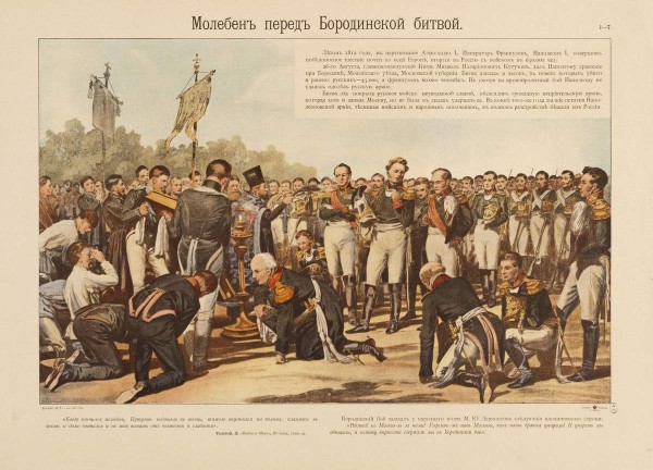 Бородинское сражение пришлось на праздник Сретенья Владимирской иконы Божией Матери — 26 августа. Накануне этого дня на Бородинском поле служили молебны перед Смоленской иконой Божией Матери. Один из таких молебнов описал в романе «Война и мир» Лев Толстой: «Кутузов вошел своей ныряющей, раскачивающейся походкой в круг и остановился позади священника. Он перекрестился привычным жестом, достал рукой до земли и, тяжело вздохнув, опустил свою седую голову. За Кутузовым был Бенигсен и свита. Несмотря на присутствие главнокомандующего, обратившего на себя внимание всех высших чинов, ополченцы и солдаты, не глядя на него, продолжали молиться». Страна побед. СПб, 2025. С. 78.