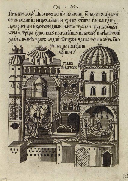 Иллюстрация к книге «Описание Иерусалима ... 1748». Лист № 9. Книги цельногравированной «Описание Иерусалима ... содеяшася Исаиа Антонович православный архиепископ и митрополит ... Симеона Симоновича архимандрита Иерусалимского ... издати благословляет в Вiеннъ 1748-го номерїа 30»