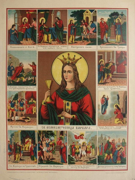 Святая Варвара Илиопо́льская (Варвара Никомиди́йская 273, Никомедия — 306, Никомедия, Ялова) — христианская великомученица. Родилась в г. Илиополе (нынешней Сирии) при императоре Максимине (305–311 гг.) в знатной языческой семье. Отец Варвары Диоскор был страстно привязан к единственной дочери. Чтобы уберечь красивую девушку от посторонних взоров и вместе с тем лишить ее общения с христианами, он построил для дочери специальный замок, откуда она выходила только с разрешения отца. Узнав, что дочь во время его отъезда приняла Крещение, Диоскор пришел в ярость и отдал ее градоначальнику со словами: «Я отрекаюсь от нее, потому что она отвергает богов моих». Варвару и еще одну христианку Иулианию долго пытали. Оставаясь верными Христу, по приказанию правителя мученицы были обезглавлены. Святую Варвару казнил сам Диоскор, но безжалостного отца вскоре поразила молния, превратив его тело в пепел.