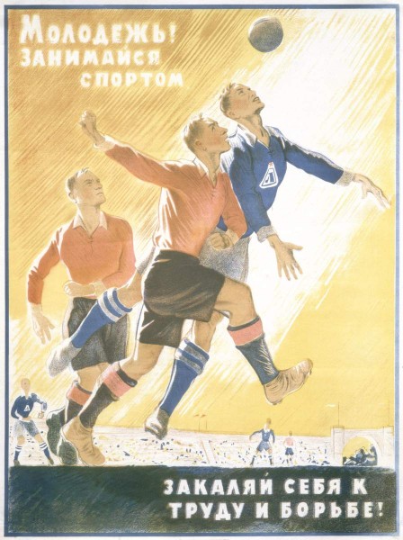 На два послевоенных десятилетия приходится расцвет популярности футбола в Советском Союзе и во всем мире. В 1956 году сборная СССР побеждает на Олимпиаде в Мельбурне, а в 1960-м выигрывает первый Кубок Европы. Все это делает футбол поистине народным спортом, сотни тысяч болельщиков, а футболистов — новыми героями мирного времени. В 1960-е годы внимание к индивидуальности и углубленному психологизму рождает новые формы осмысления знакомых тем. Егор Могилевский. «Молодежь — на стадионы!» // Спорт в советском фарфоре, графике, скульптуре. СПб, 2018. С. 7-8.