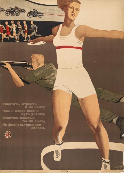 Спорт как неотъемлемая часть подготовки человека к любым трудностям становится лейтмотивом таких работ, как «Военизированный комсомол» Александра Самохвалова (Ж-8235) и «Легкоатлетическое соревнование» Алексея Почтенного (Ж-9811), проявляясь в открытой форме в плакатах «Выше знамя красного спортинтерна. Крепите фронт пролетарских спортсменов против войны и фашизма!» (Гр.Пл.-321) Петра Караченцова и «Работать, строить и не ныть…» Дейнеки (где есть такие слова: «Атлетом можешь ты не быть, но физкультурником — обязан»).