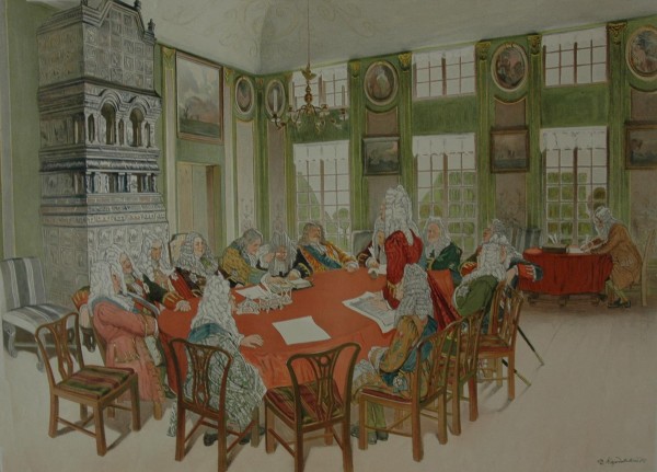 22 февраля 1711 года Петр учредил Правительствующий Сенат, орган для управления государством во время отсутствия государя. Заседания Сената проходили сначала ежедневно, потом были назначены для этого особые дни: понедельник, среда и пятница. Ввиду отсутствия поначалу определенного места заседаний сенаторы собирались то в доме Меншикова, то в Летнем дворце. Кардовский изобразил одно из таких собраний, однако интерьер данного помещения — плод его художественной фантазии. И мореплаватель, и плотник. Петр Великий в русской художественной культуре. СПб, 2022. С. 139.