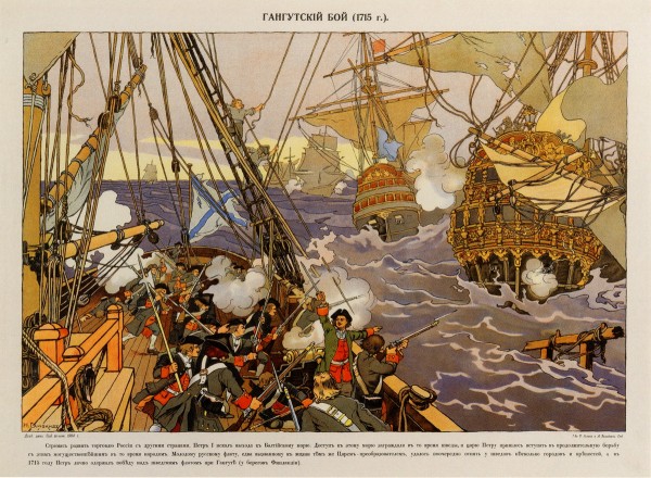 Морское сражение 27 июля 1714 года у мыса Гангут (полуостров Ханко в Финляндии) в Балтийском море стало первой морской победой русского флота. Гангутский бой был одним из последних крупных сражений в истории флота, в котором решающую роль сыграл абордажный бой. За этот бой Петр I произведен в вице-адмиралы. И мореплаватель, и плотник. Петр Великий в русской художественной культуре. СПб, 2022. С. 108.