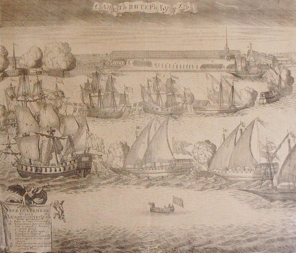 8 сентября 1720 года четыре шведских фрегата, плененные в сражении при Гренгаме 27 июля 1720 года, в сопровождении кораблей русского военного флота были введены в Неву. Морской парад принимал Петр I. Его ботик изображен на первом плане. Затем русские моряки, плененные шведские офицеры и матросы сошли на берег перед Троицкой площадью и прошли в торжественном марше через специально построенные триумфальные ворота. Работа над гравюрой была начата заранее, и к празднику она уже была готова.