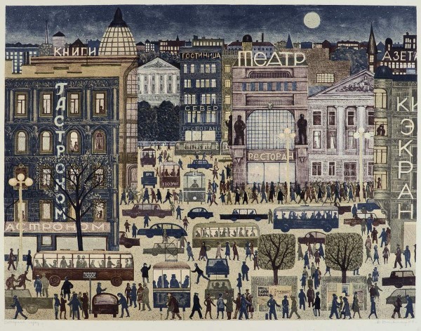 Как в любой большой работе, в серии «Дни нашей жизни» есть удачи и неудачи. Но в лучших листах сохранилось удивительно верное ощущение Ленинграда–Петербурга, в котором невозможно разделить вечное и преходящее. Вот, например, лист «Белая ночь» (1972), насыщенный всеми атрибутами, которые положено увидеть во время ночной прогулки. Разведённый мост, караван судов, проходящий по спокойной реке, плавучий ресторан, гуляющие молодые люди... <...> В то же время в композиции «Вечерний город» (1968) переливается разноцветными огнями оживлённый, нарядный и сегодня узнаваемый Невский проспект, полный предчувствий и предвкушений новых встреч, развлечений, свиданий. Н. М. Козырева. Роман с литографским камнем //Виктор Вильнер. Роман с литографским камнем. Живая графика художника, влюблённого в Петербург. М.: Центрполиграф, 2016. С. 16-17.