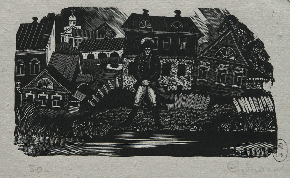 - Бумага, ксилография. И.: 5,5 х 9,6. Л.: 8,3 х 12,8